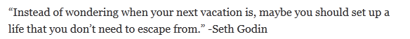 Instead of wondering when your next vacation is, maybe you should set up a life that you don’t need to escape from. ~ Seth Godin