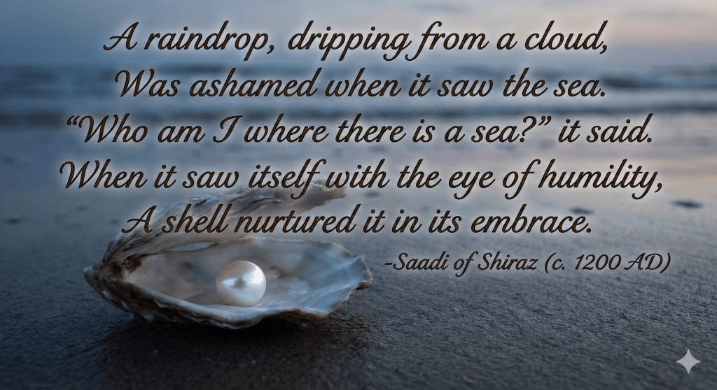 Saadi suggests that this feeling of smallness—this humility—isn’t a weakness. It is actually the necessary container for growth. The raindrop in his poem doesn’t try to become the ocean. It accepts its size. And it is precisely that acceptance that allows it to be nurtured into something far rarer than water: a pearl.