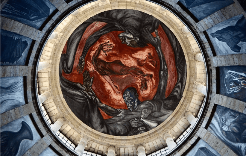 Often called the “Sistine Chapel of Latin America,” this fresco is located in the dome of a former hospital and orphanage. It depicts a central figure consumed by flames, surrounded by four other figures representing the elements.
