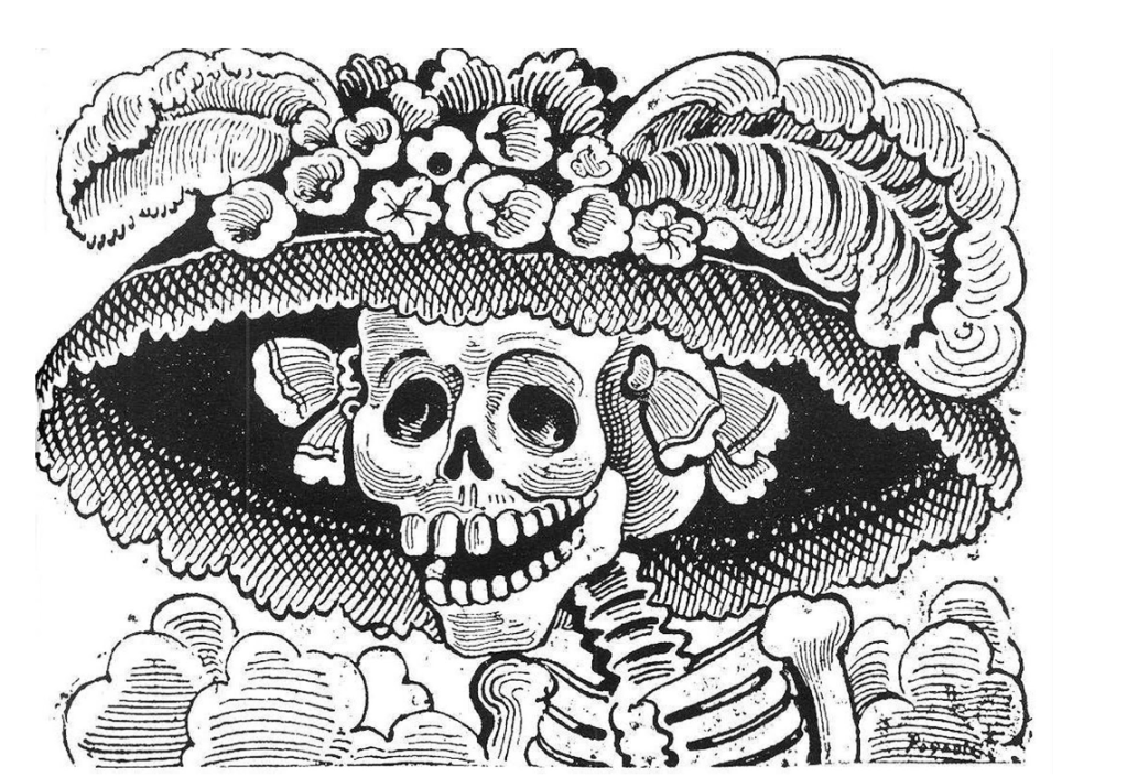 While originally a zinc etching by José Guadalupe Posada (1913), this “Elegant Skull” has become the definitive symbol of Mexico’s Day of the Dead. It was later popularized in color by Diego Rivera in his mural Dream of a Sunday Afternoon in the Alameda Central. Google Arts & Culture – La Catrina: https://artsandculture.google.com/asset/la-catrina-jos%C3%A9-guadalupe-posada/XgGIMPc3XjHC8w